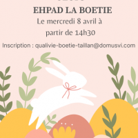 Publiée le 05/03/2026Nous invitons les enfants à venir participer à une chasse aux œufs le mercredi 8 avril à partir de 14h30 ! Merci de vous inscrire à l’adresse suivante : qualivie-boetie-taillan@domusvi.com en précisant le nombre d’enfants. Nous avons hâte de vous retrouver pour ce moment gourmand et conv [...] Lire la suite